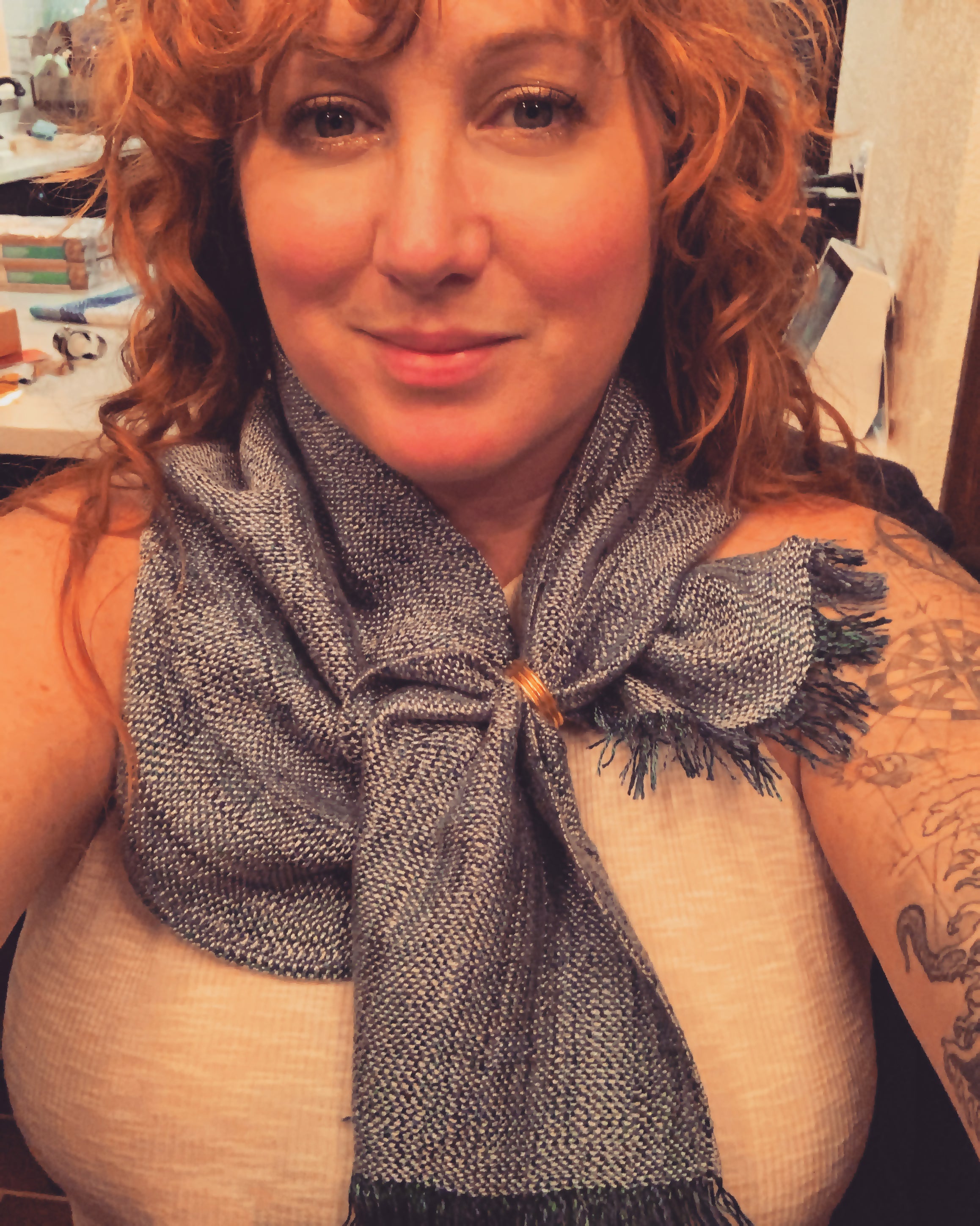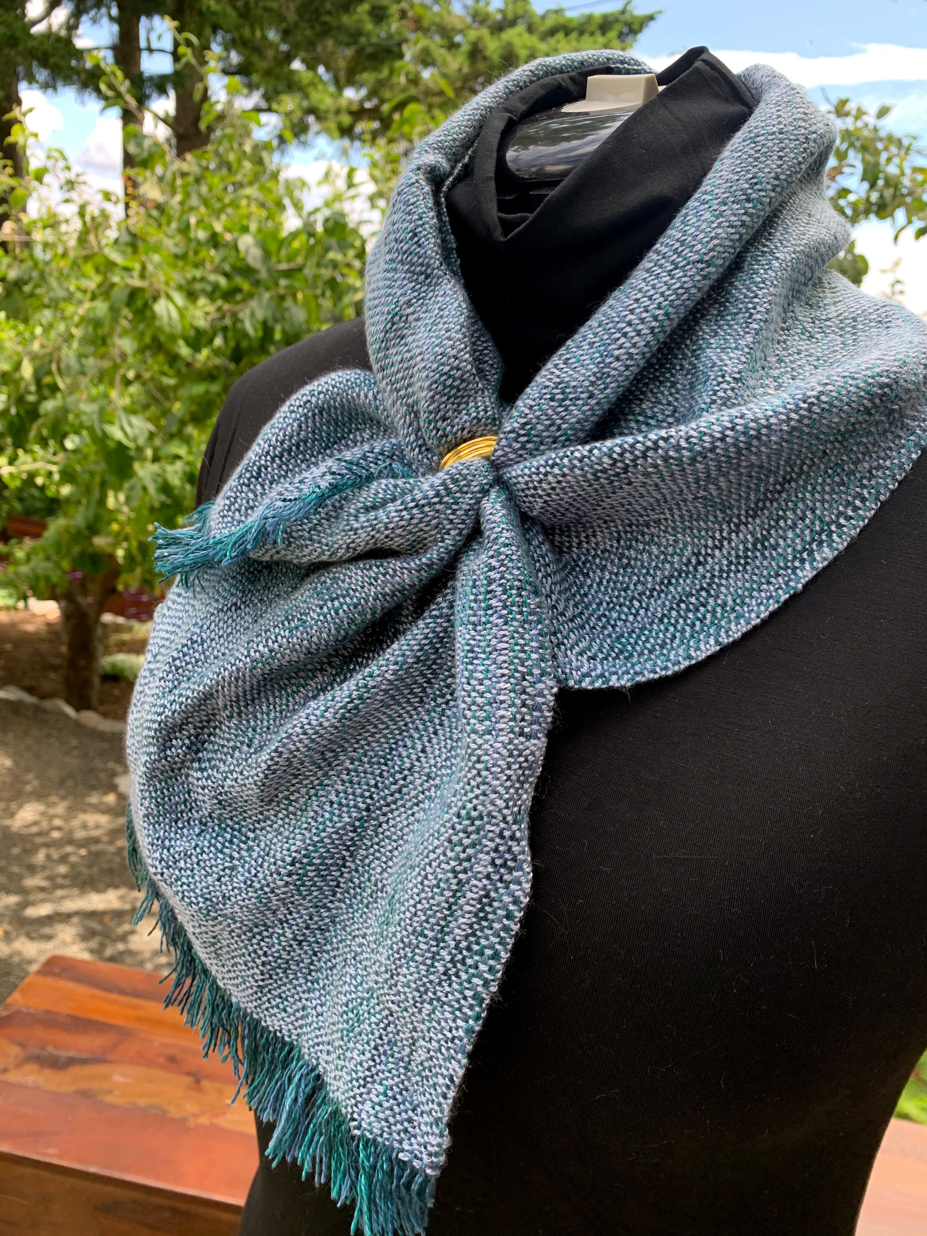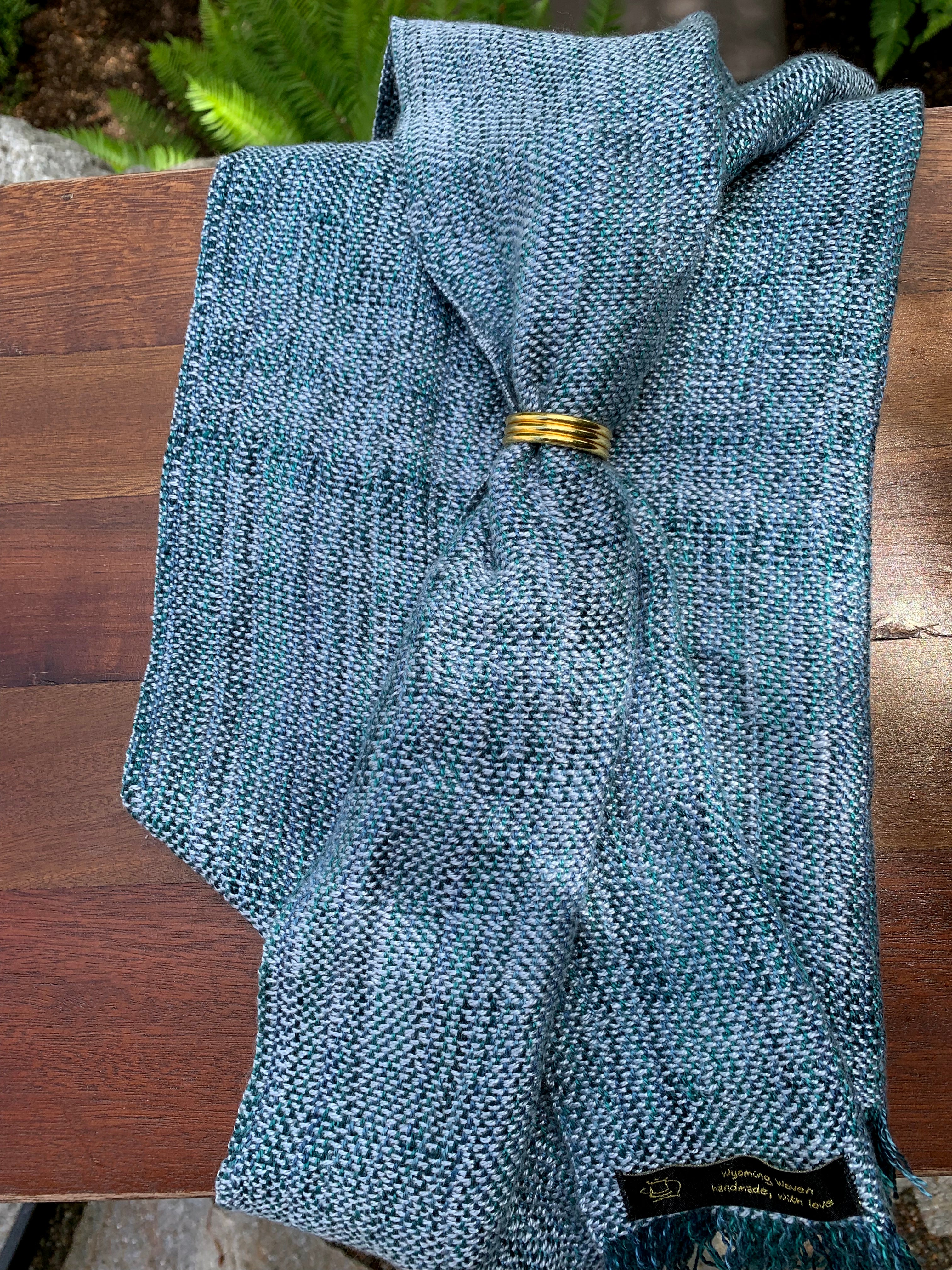 Part of our Zero Waste Collection*, the Who's The Boss Neck scarf made from left-over warp from our Sea of Cortez scarf. Ice Blue and multicolored Peacock, Teal, and Navy Tencel, and fastened with a trio of gold rings to make you feel like the boss you are!