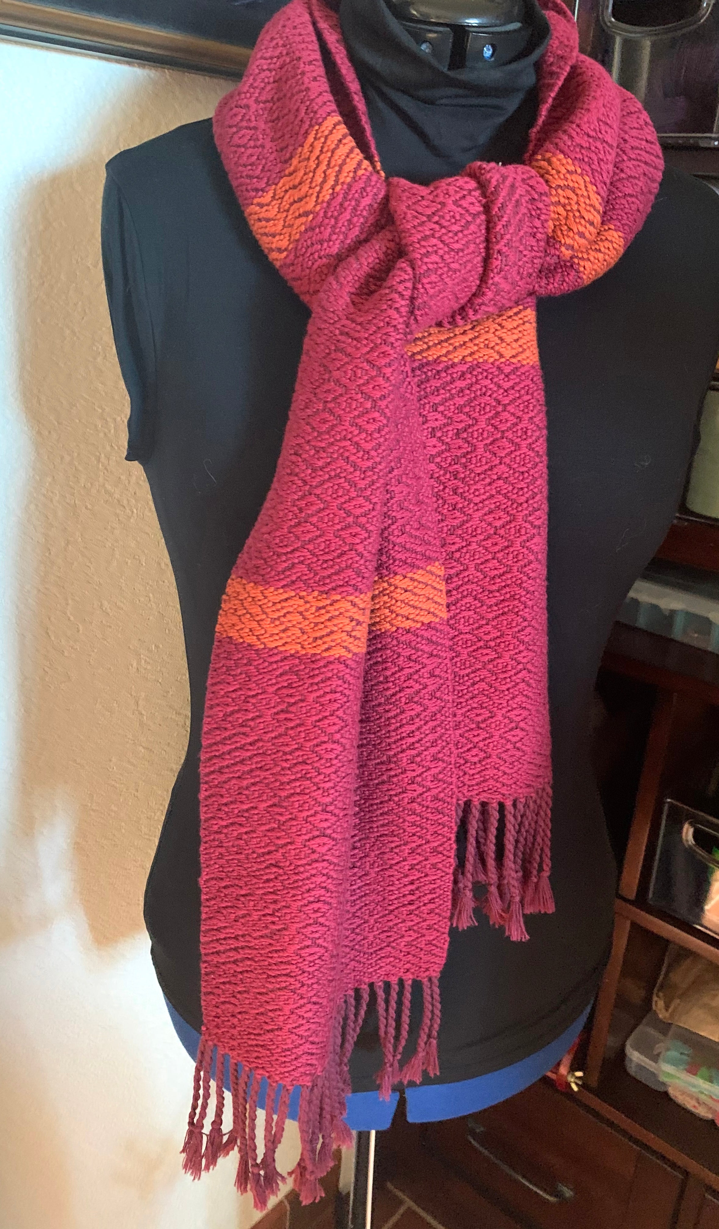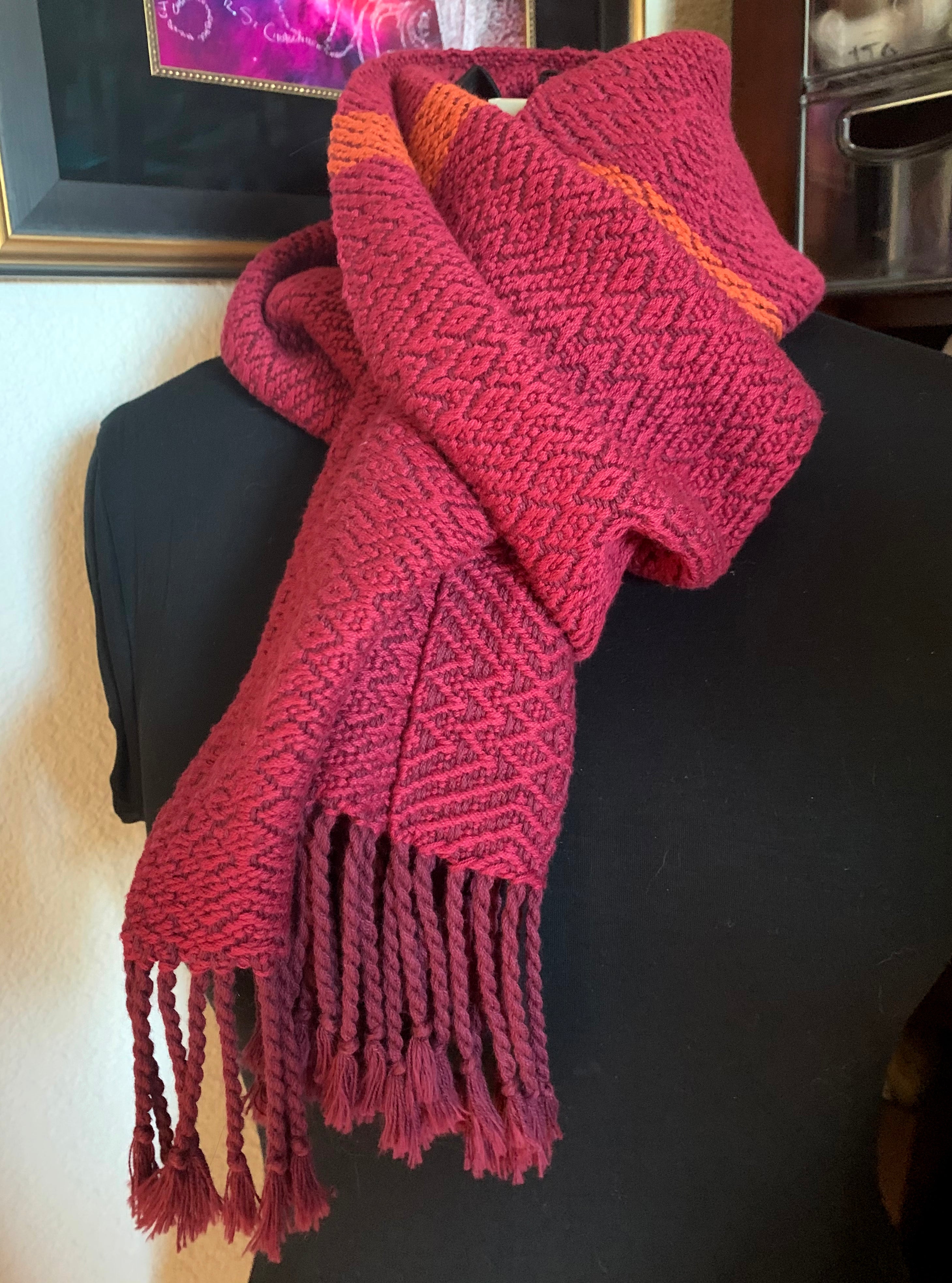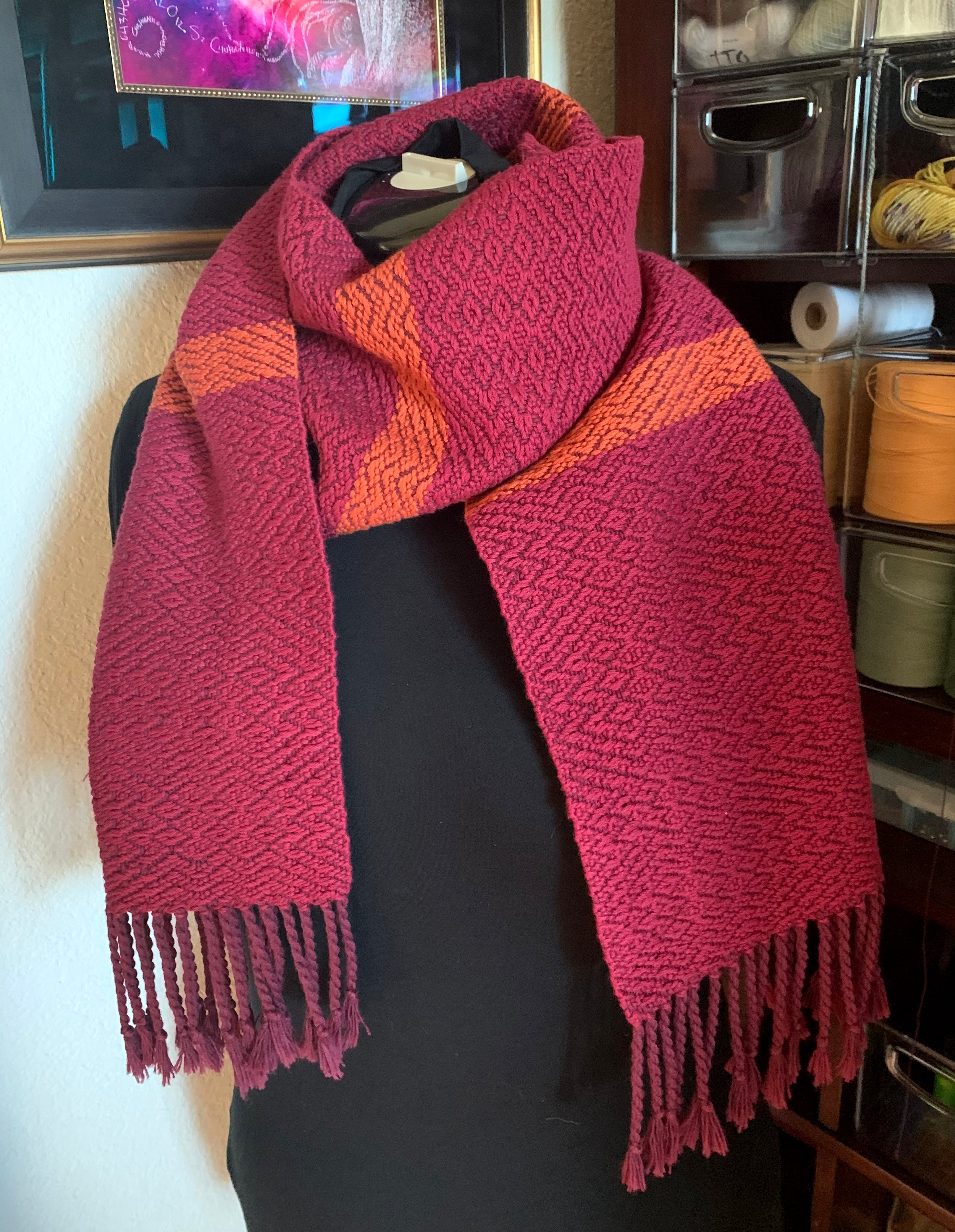 Our Point Twill Unisex scarf is made of 100% cotton. Burgundy and raspberry diamond patterns are accented with striking turmeric stripes. The perfect weight, this scarf will be your favorite for spring and summer nights.