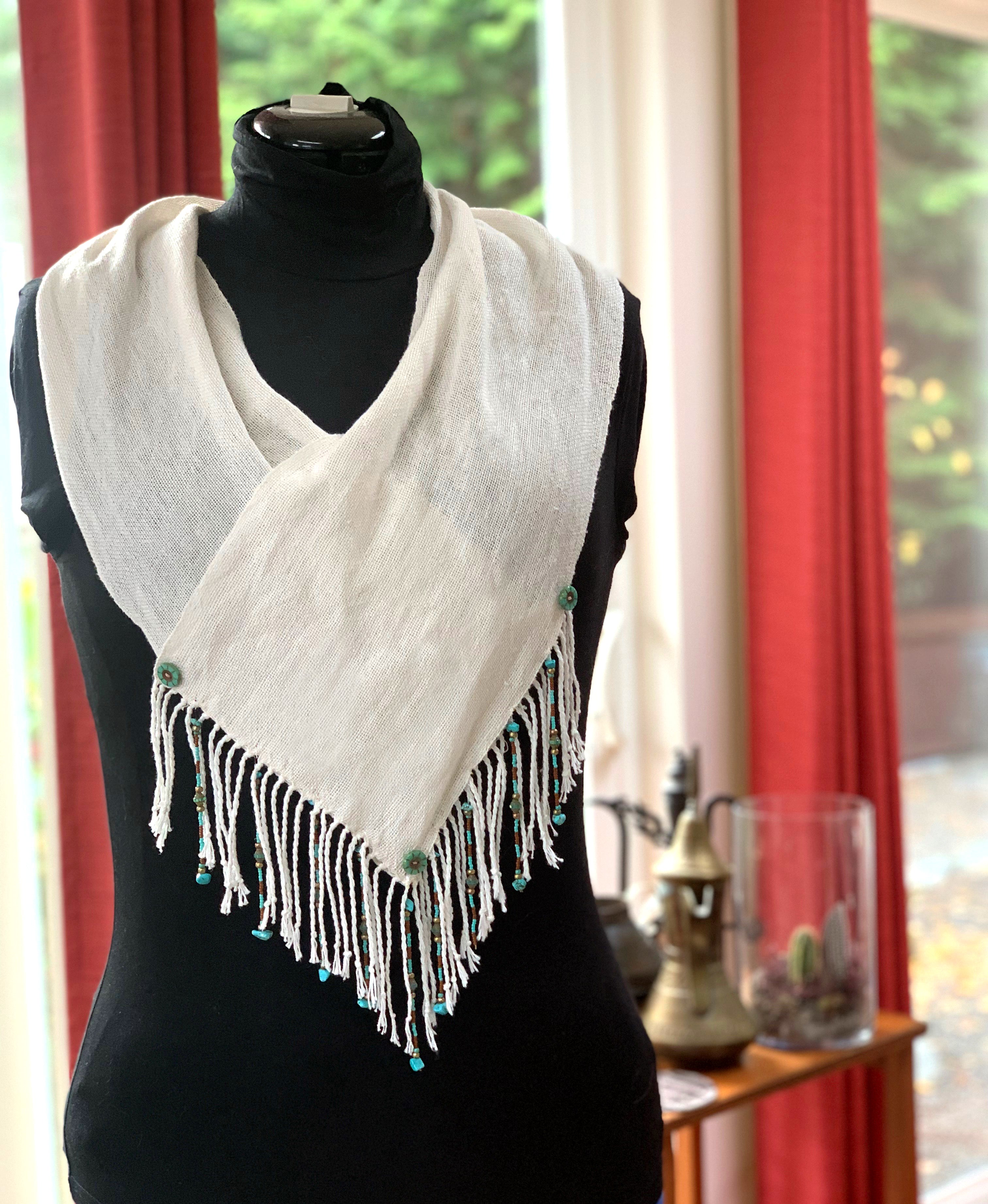 Part of our Zero Waste Collection*, the On The Fringes Neck Scaf is made from left-over warp from our a custom commission. Linen and organic cotton are woven in plain weave for a light summer weight statement piece. Vintage turquoise, glass beads and vintage buttons are hand-sewn into the fringe for a boho vibe.